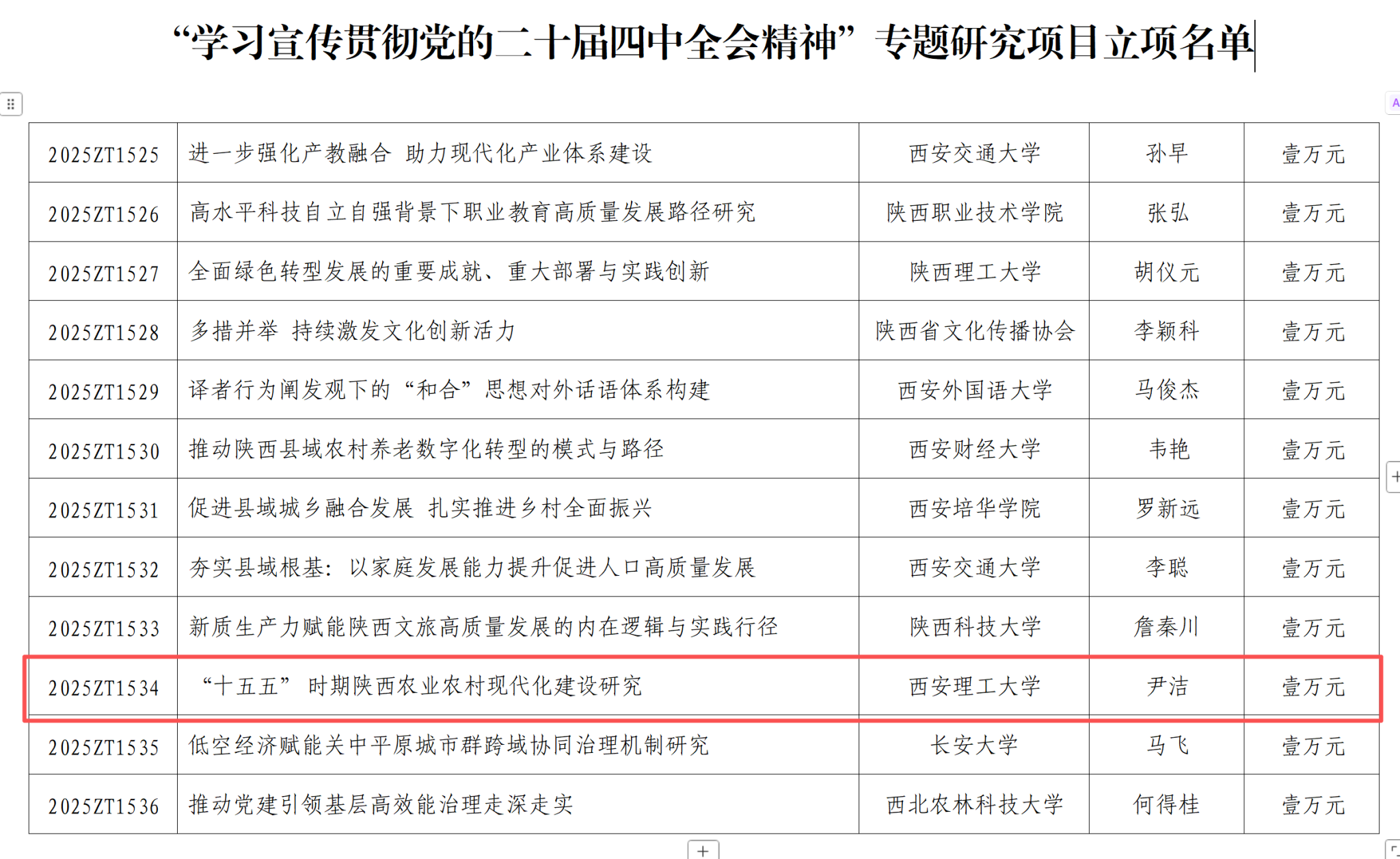 1.尹洁获批陕西省社科联“学习宣传贯彻党的二十届四中全会精神”专题研究项目