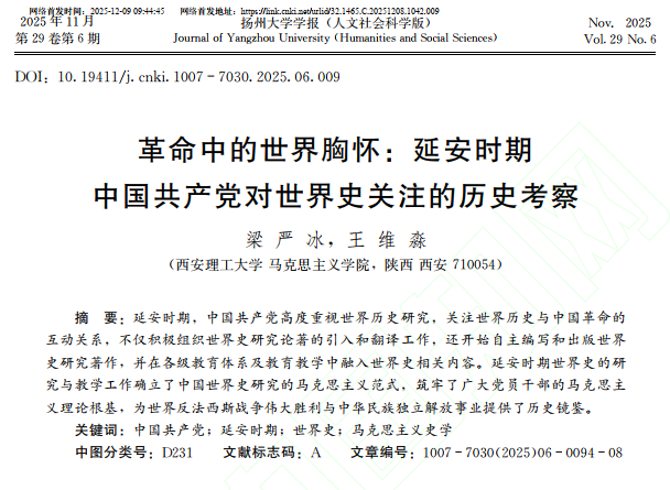 摘要:延安时期,中国共产党高度重视世界历史研究,关注世界历史与中国革命的互动关系,不仅积极组织世界史研究论著的引入和翻译工作,还开始自主编写和出版世界史研究著作,并在各级教育体系及教育教学中融入世界史相关内容。延安时期世界史的研究与教学工作确立了中国世界史研究的马克思主义范式,筑牢了广大党员干部的马克思主义理论根基,为世界反法西斯战争伟大胜利与中华民族独立解放事业提供了历史镜鉴。