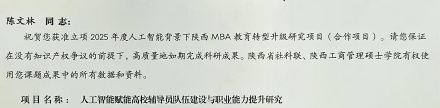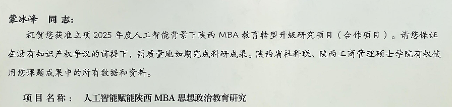 4.陈文林、蒙冰峰获批2025 年度人工智能背景下陕西 MBA 教育转型升级研究项目(合作项目)