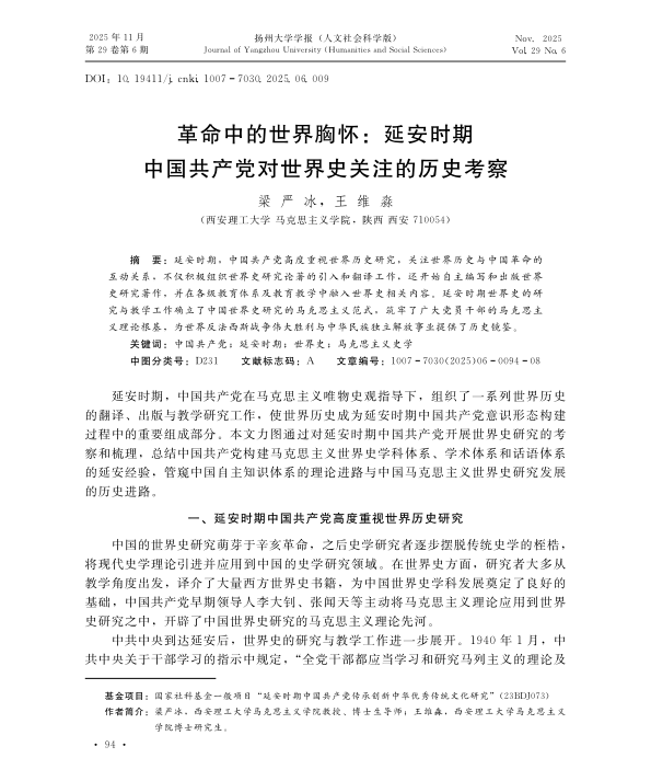 近日,我院梁严冰教授及其指导的博士研究生王维淼合作撰写的学术论文《革命中的世界胸怀:延安时期中国共产党对世界史关注的历史考察》被中国人民大学书报资料中心“复印报刊资料”《历史学文摘》2026年第1期全文转载。该文原刊发于《扬州大学学报(人文社会科学版)》“历史与文化研究”栏目,2025年第6期。