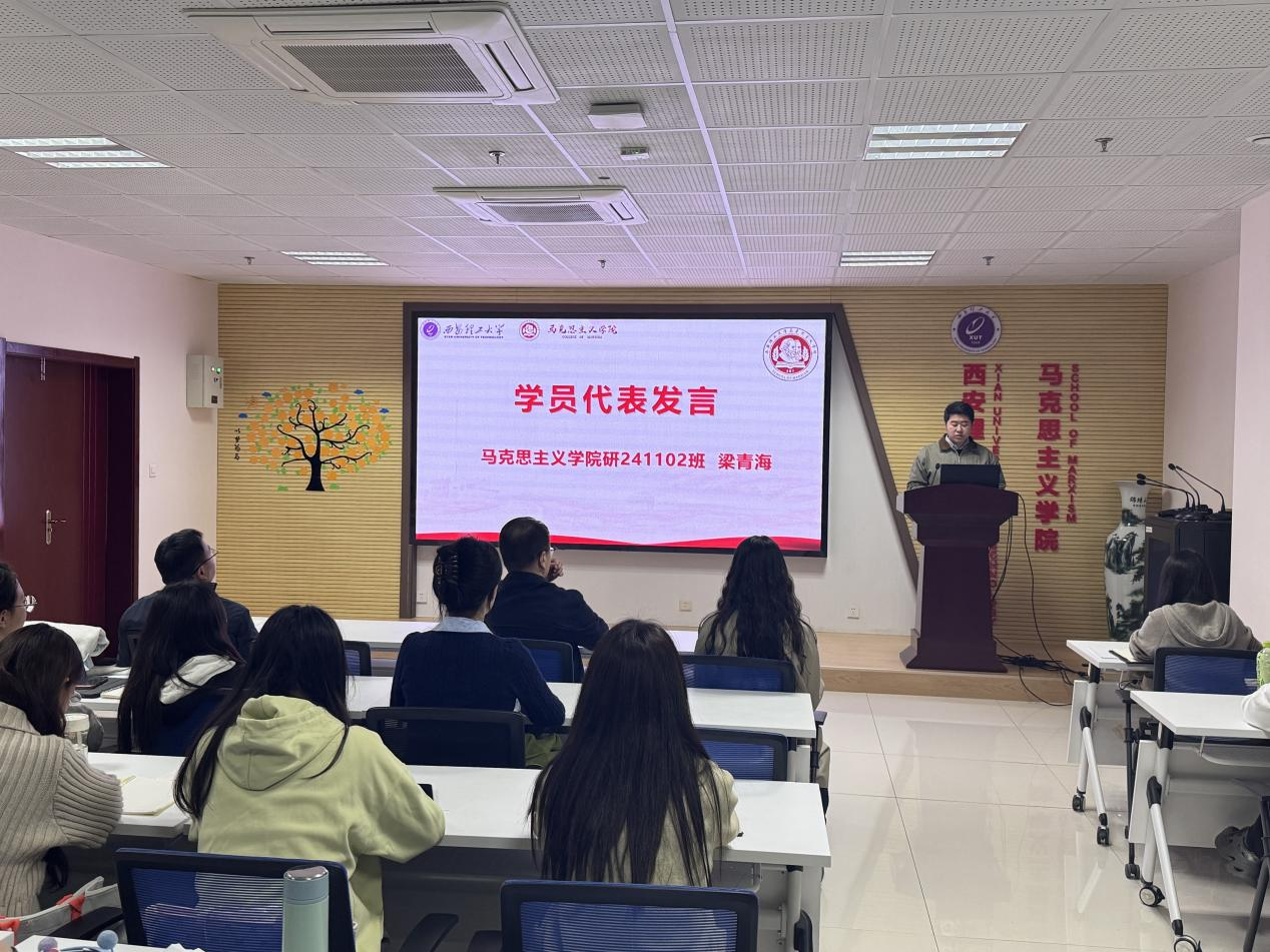 研241102班梁青海同学代表全体学员发言。他表示全体学员将十分珍惜此次校党课的学习机会,遵守培训纪律,接受党组织的全面考验,争取早日成为合格的中国共产党党员。同时,他呼吁全体学员,在本次培训中做到以下几点:一以理论学习筑牢信仰之基;二以党性修养校准行动坐标;三以实干担当彰显青春价值。