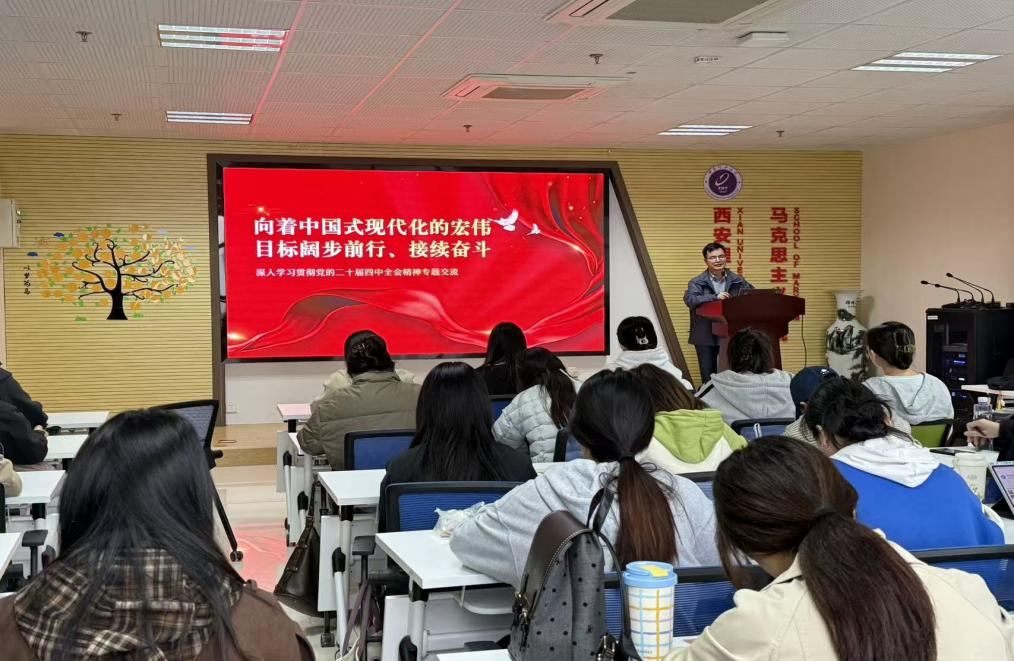 副院长蒙冰峰对党的二十届四中全会精神展开理论解读,阐释了“十五五”时期作为基本实现社会主义现代化关键阶段的承前启后地位,以及中国式现代化在理论创新与实践推进中的核心要义,号召全体同学深化理论武装,把学习成效转化为实际行动。