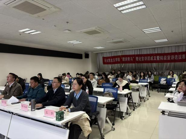 为深入学习贯彻习近平新时代中国特色社会主义思想,扎实推动党的创新理论在校园落地生根、开花结果,10月23日晚,我院在综南楼911报告厅隆重举行“理润青马”理论宣讲团成立仪式暨院级宣讲选拔赛。本次活动由我院学生社团——研究生基层党建服务队承办,活动邀请到院党委副书记陈文林老师,中国近现代史纲要教研室王卫、潘胜强老师和院团委书记王梦老师出席担任评委;研究生基层党建服务队全体成员、2025级部分学生到场观摩学习。