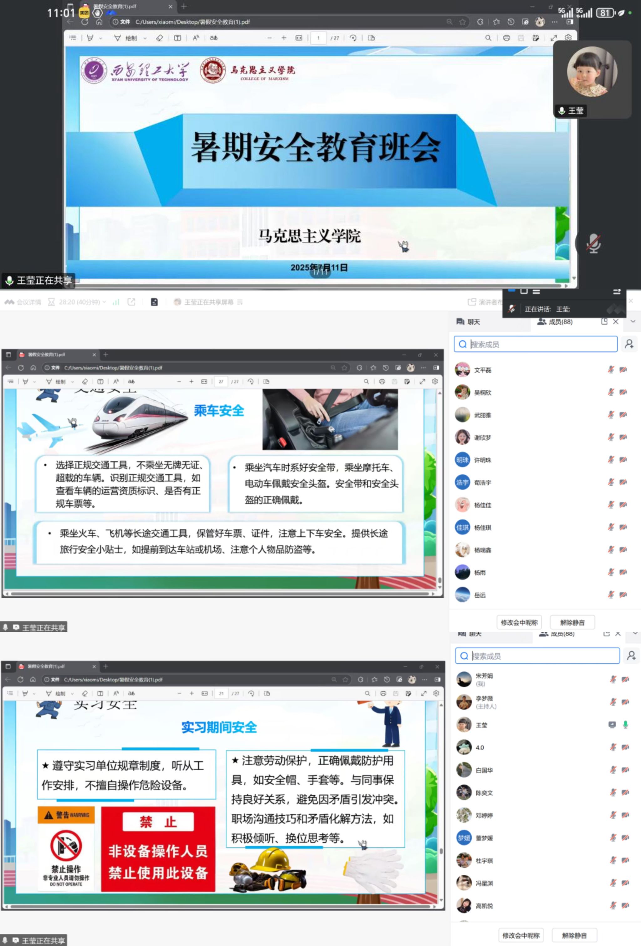 辅导员王莹老师围绕防溺水、防意外伤害、防火防盗防骗三大主题展开,并针对研究生实习实践、科研、出行等场景提出具体建议,为同学们平安度过假期提供了全面建议。对于计划留校或外出实习的同学,特别强调要遵守学校留校管理规定和实习单位规章制度,保持通讯畅通,定期向家长和辅导员报备动态;对于返乡同学,注意交通安全,确保平安返乡、顺利返校。