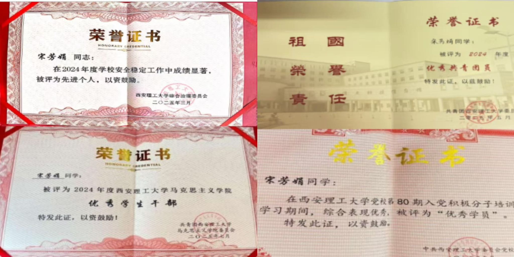 担任研241101班班长期间,获评校级“学校安全稳定先进个人”,所在宿舍获校级“优秀文明宿舍”并带动班级宿舍建设;组织参与学院合唱比赛助力获“优秀组织奖”,推进班团一体化建设使班级获评校级“先进班集体”,个人还获“优秀研究生干部”“优秀共青团员”、党校培训班“优秀学员”等多项荣誉。