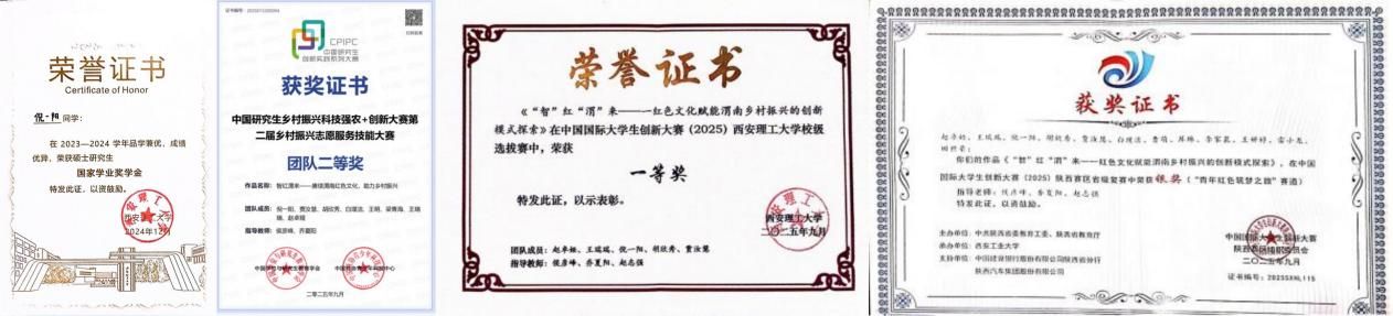 倪一阳始终以“尚真笃学”为准则,不仅以平均分91.7分稳居专业第一,更将理论优势转化为硬核成果,先后斩获国家奖学金、国家学业奖学金。在竞赛赛道上,她更是带领团队屡创佳绩:以队长身份牵头参与“中国研究生乡村振兴科技强农+创新大赛”,凭借《赓续渭南红色文化,助力乡村振兴》的实践方案获得国家级二等奖;参与“中国国际大学生创新大赛”,以《“智”红“渭”来——红色文化赋能乡村振兴的创新模式探索》先后斩获校级一等奖与省级银奖,用实力证明了马院学子的创新力与实践力。