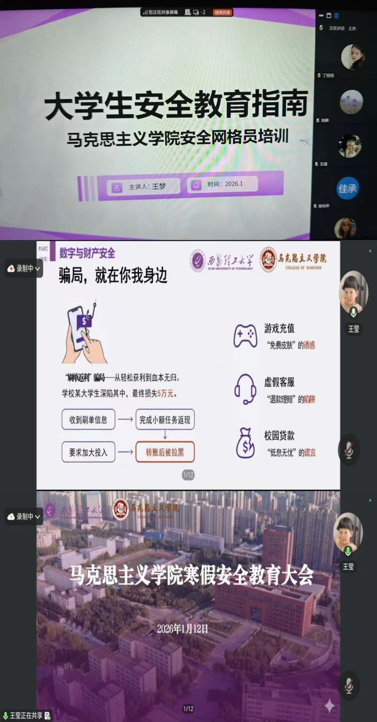 为切实做好寒假期间学生安全教育管理工作,进一步提升学生安全防范意识,2026年1月12日和14日,马克思主义学院各年级分别组织召开了寒假前安全教育暨安全网格员培训会。