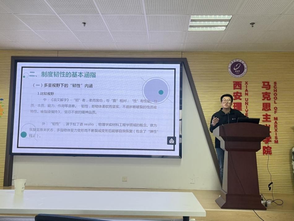 为推动马克思主义学院理论学科创新发展,激发研究生学术探索活力,2026年1月13日下午,马克思主义学院在综合楼911报告厅成功举办2026年第1期研究生青年创新论坛。本次论坛以“制度韧性理论论纲”为核心主题,由学院办公室主任王锋老师主持,由当代马克思主义教研室白向龙老师担任主讲人。