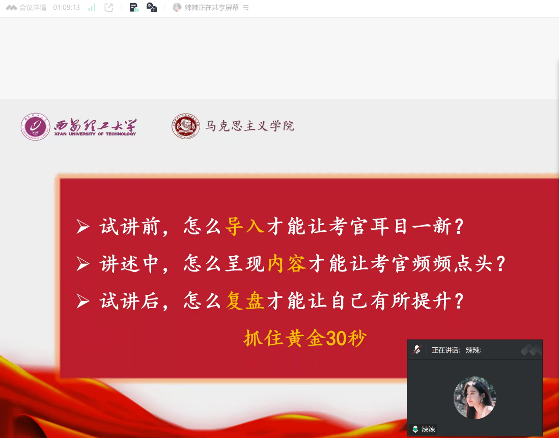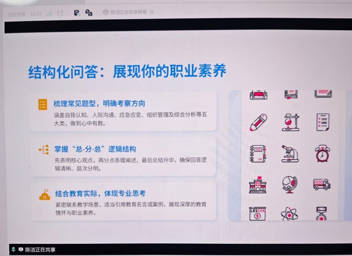 任娜娜以“站上三尺讲台需要做哪些准备工作?”为题,重点向同学们讲述了试讲环节的丰富经验。在试讲实战层面,她强调,“抓住评委注意力”是成功的核心,主张以“眼前一亮”的设计破解评委审美疲劳。她系统梳理了问题直击、实物载体、时政素材三类导入方式,推荐融入《人民日报》评论来展现思政课教师的政治敏锐度;在内容展开上,她主张以小见大讲好故事,采用角色代入法避免模板化互动。针对教学实效,她强调,知识点讲解要细、板书设计要巧(如树状图),以结构化思维构建完整逻辑体系。此外,她分享了应对卡壳的具体策略,并建议全面复盘内容设计、教姿、教态与试讲效果,将细节把控贯穿面试全过程。