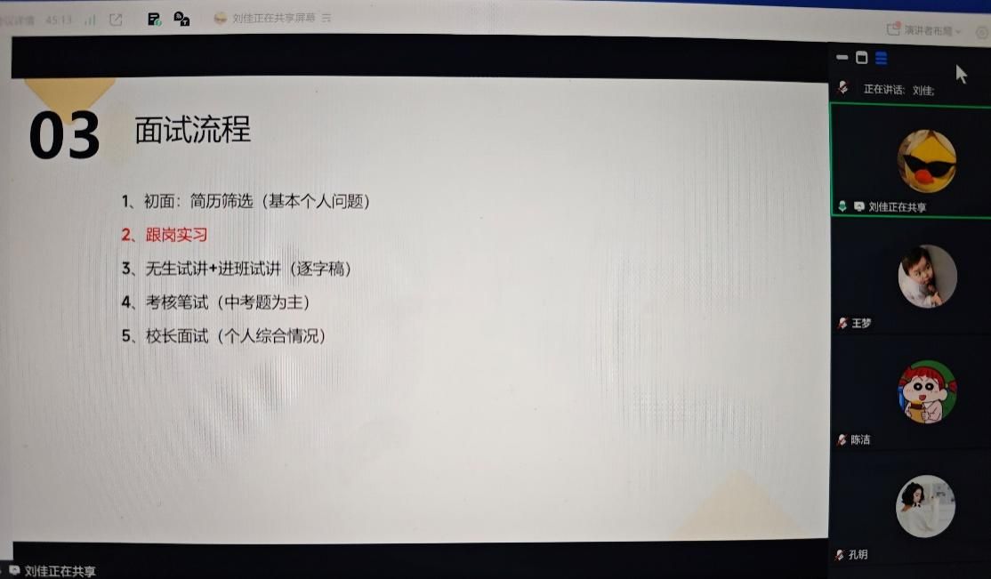 刘佳系统分享了信息筛选、简历投递与面试准备的实战经验。她建议从专业角度精准搜索岗位,提倡在线上投递简历的过程中录制个人教学视频来立体化展示自己的教学能力。针对投递后的等待期,她建议电话跟进以掌握主动权。在简历优化上,她主张灵活包装个人经历,以突出岗位适配性,并特别指出,要在校长面试中,展现出自己的奉献精神和实干精神,主动争取机会才能尽快找到心仪工作。