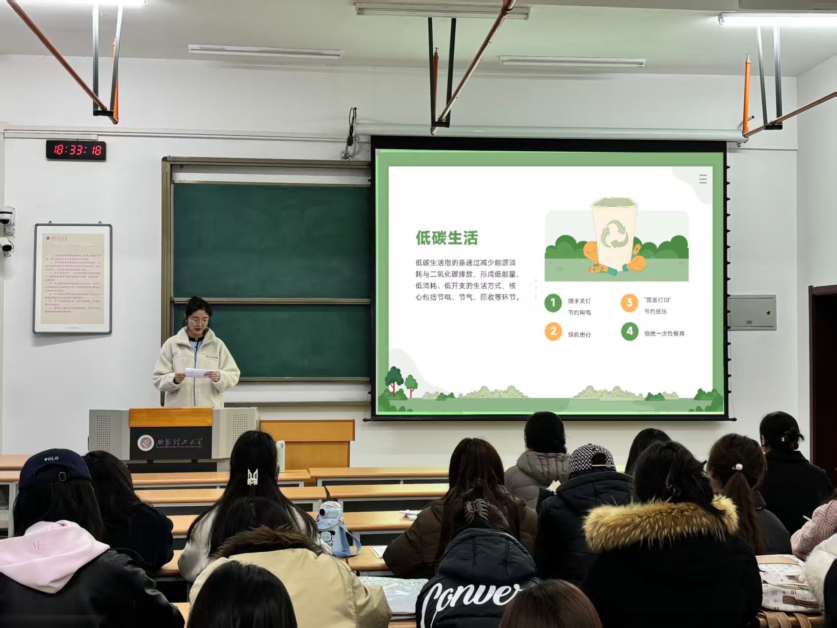 环保知识微宣讲环节拉开活动序幕。团支书围绕低碳生活理念、校园环保小贴士等内容,用生动的案例、通俗的语言,向在场同学普及节约资源、绿色生活等环保知识,号召大家将环保理念融入日常学习生活,从点滴小事做起,争做生态文明理念的传播者和实践者,让绿色成为青春最鲜明的底色。