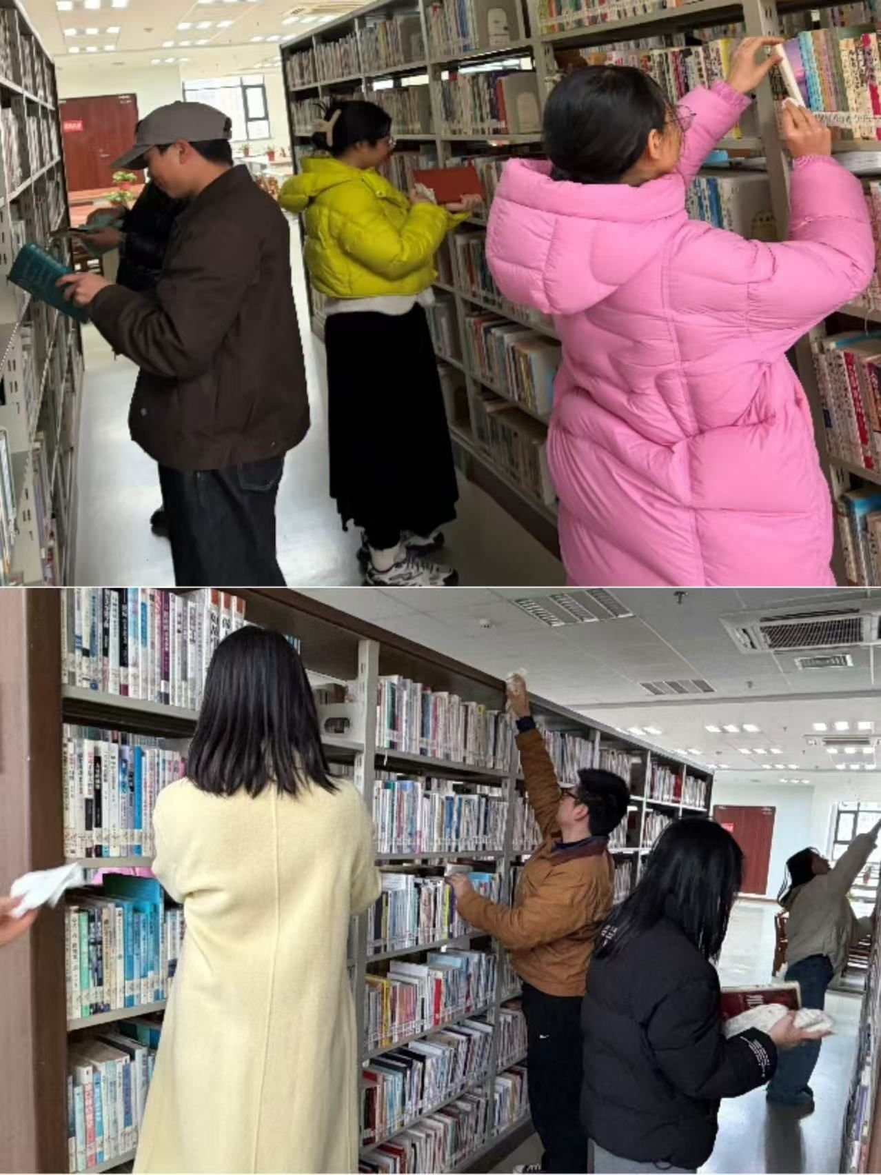 清晨的阳光洒满校园,同学们早早携带抹布、扫帚等清洁工具,在图书馆前集合。大家分工协作,分成若干小组,对图书馆周边绿植区域的垃圾进行细致清理。他们弯腰捡拾纸屑、塑料瓶、烟头等废弃物,不放过任何一个角落,用劳动守护校园环境的整洁。随后,部分同学继续在室外区域开展清洁工作,另一组同学则轻声进入图书馆,在保持安静的前提下,认真擦拭图书架,清理书架缝隙的灰尘,整理错位的书籍,为读者营造整洁舒适的阅读环境。