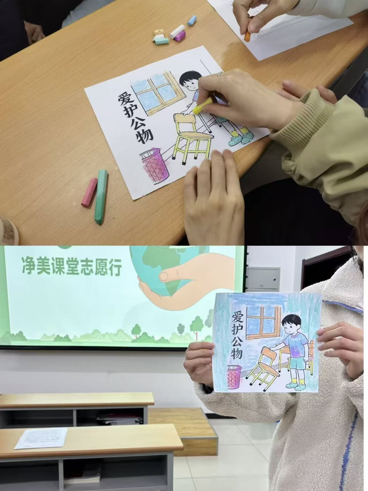 随后,同学们收集到的废旧粉笔头成为了“创作素材”。大家充分发挥创意,将长短不一的废旧粉笔进行整理利用,以环保为主题,绘制出一幅幅色彩鲜明、寓意深刻的填色画,有的展现低碳出行场景,有的呼吁节约资源,每一幅作品都承载着大家的环保心愿。绘制完成后,志愿者们将作品张贴在教室显眼位置,让残笔“重获新生”,既美化了课堂环境,也时刻提醒同学们践行环保理念。